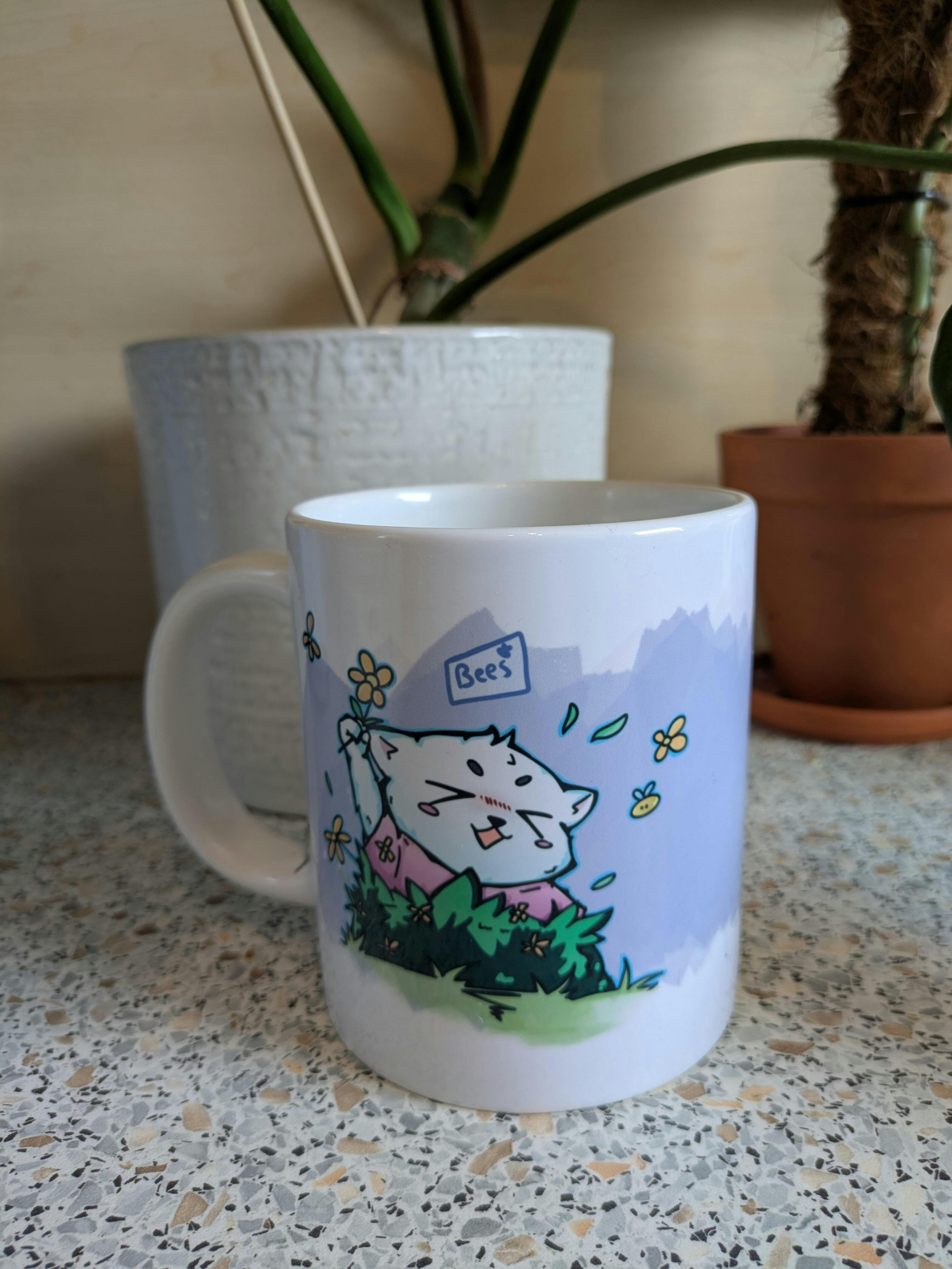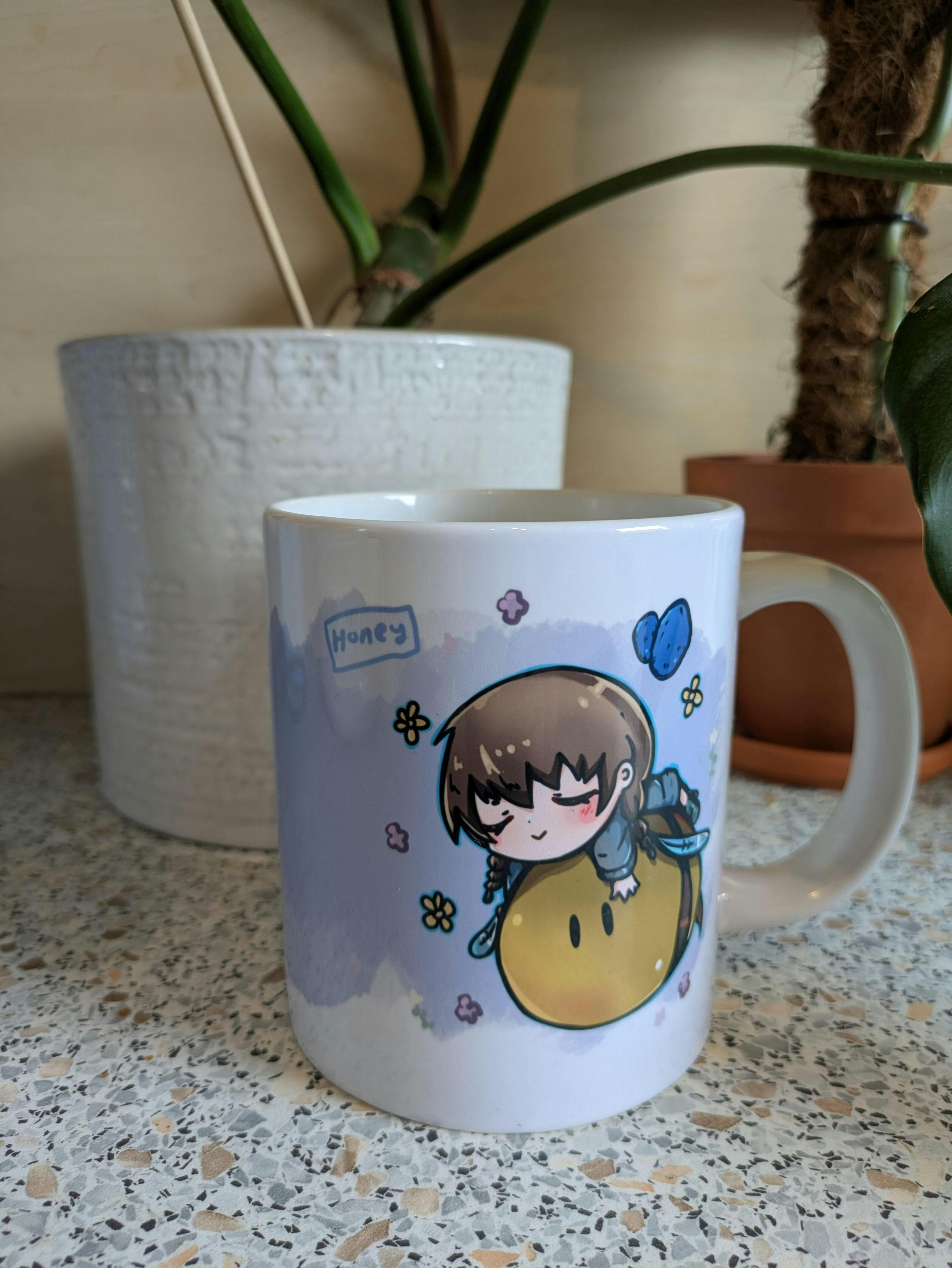 Amazing mug. The art on it is adorable, with sleepy Nanette, Apista and Mrsha. Even after a good two dozen rounds in the dishwasher, there's no sign of any wear and tear. The 20oz one (which you should really look up how much that actually is), has a flat bottom, which I really really appreciate.